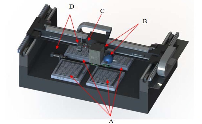 图 2. A区域:4块LED 转载模块, B区域:两测试模块, C区域:LED标识工具,D区域:视觉定位模块.